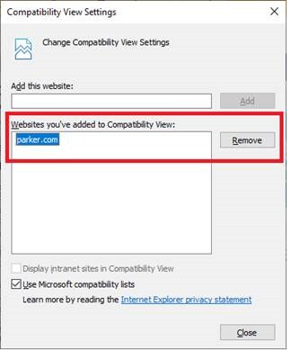 *Note: if you are using Internet Explorer 10 or above and still having issues, please try removing parker.com from Internet Explorer Compatibility Settings. Open Tools -> Compatibility View Settings and click parker.com and then click remove.
